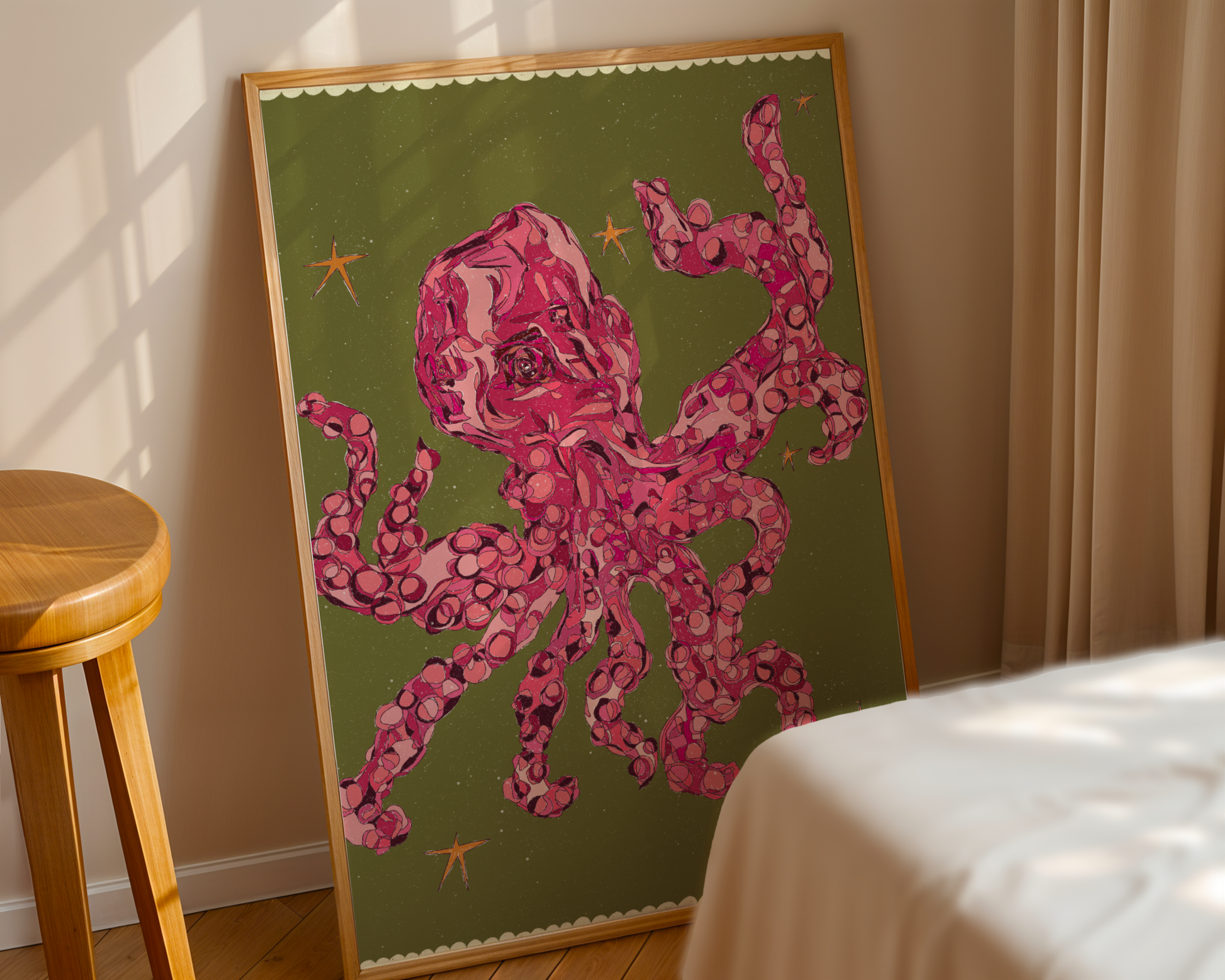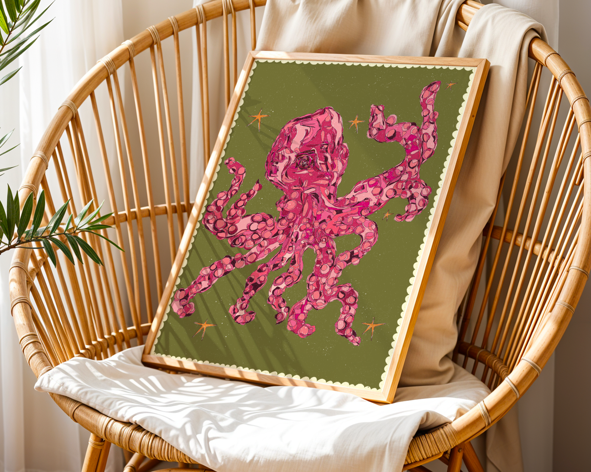 A pink octopus with plenty of personality, floating proudly against a rich khaki green backdrop, it’s giving under-the-sea chic with a girly twist!
