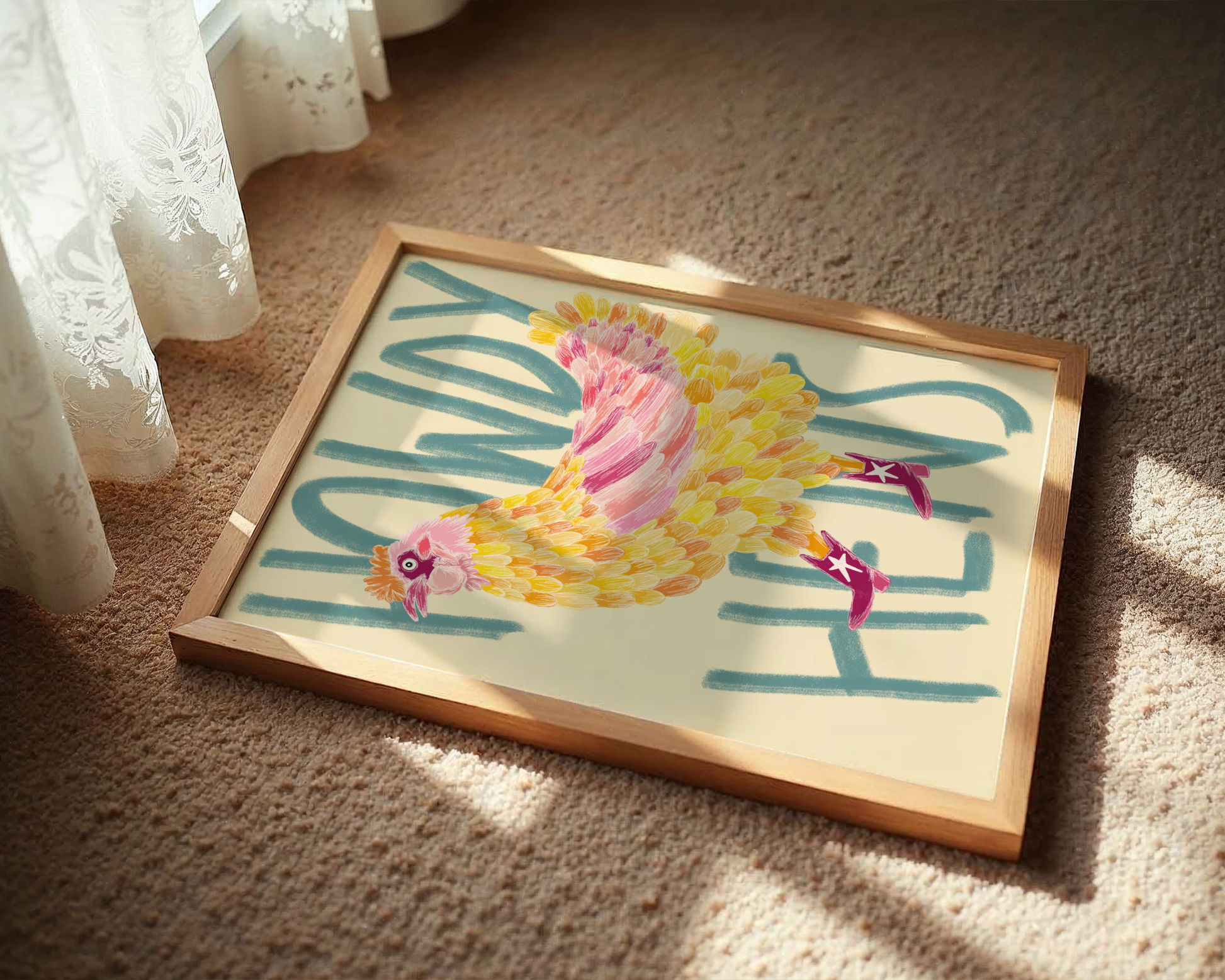 Okay but seriously… who gave this chicken cowboy boots?! Equal parts country charm and girly giggles, this print is the perfect dose of yeehaw energy for your walls.
