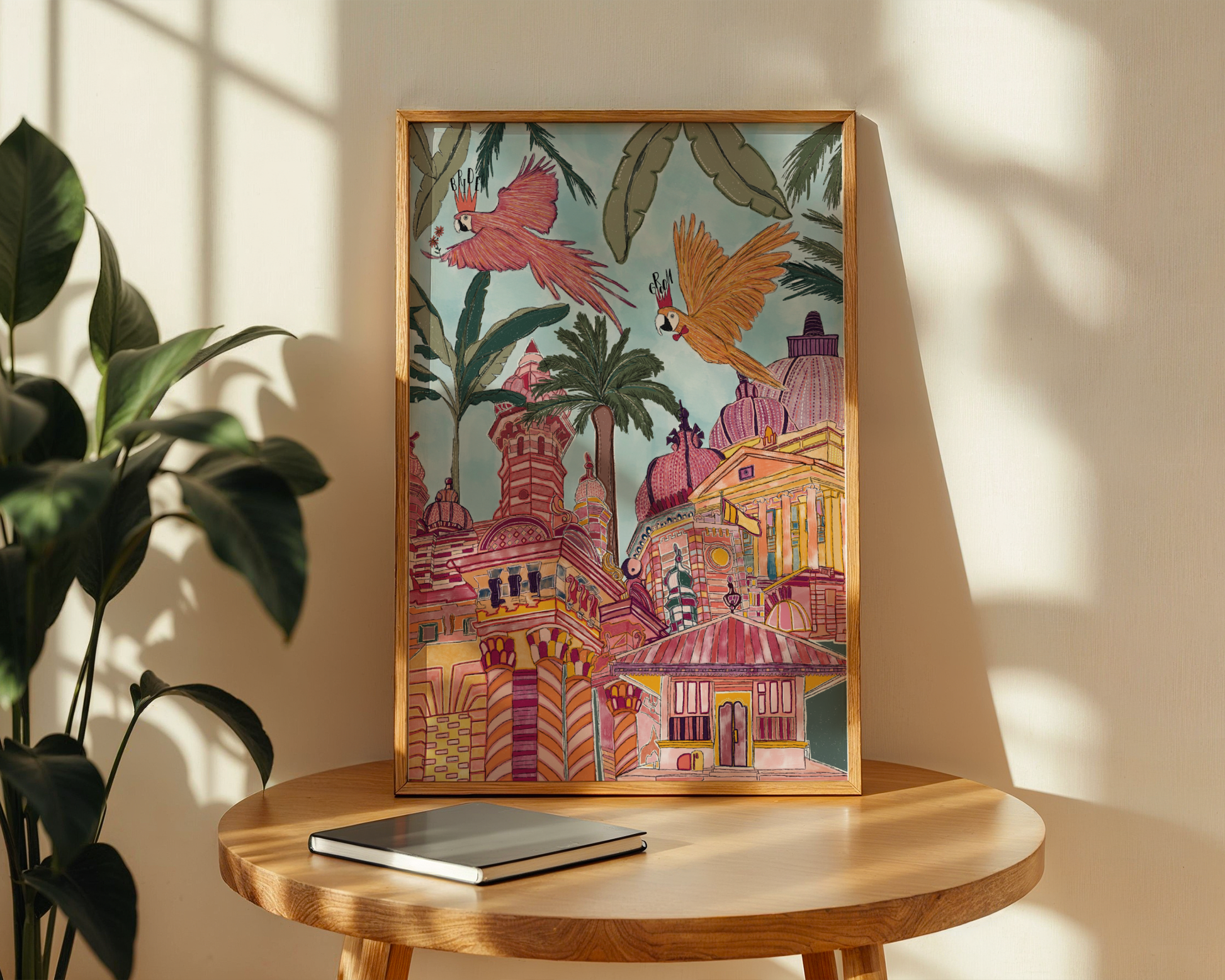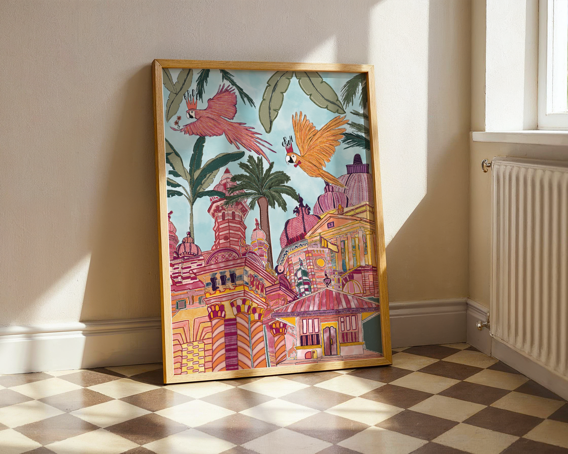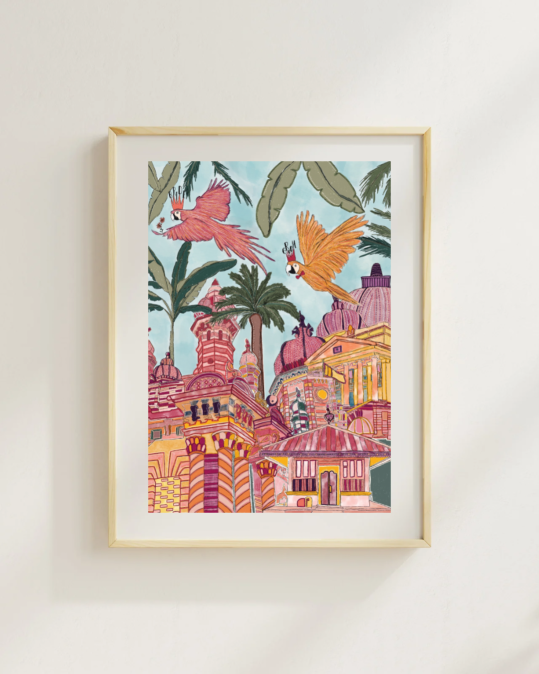Two loved-up macaws perched in the lush Sri Lankan jungle — colourful, tropical, and totally smitten. This print is bursting with bold greens, pinks, and playful details, making it the perfect piece for celebrating love!