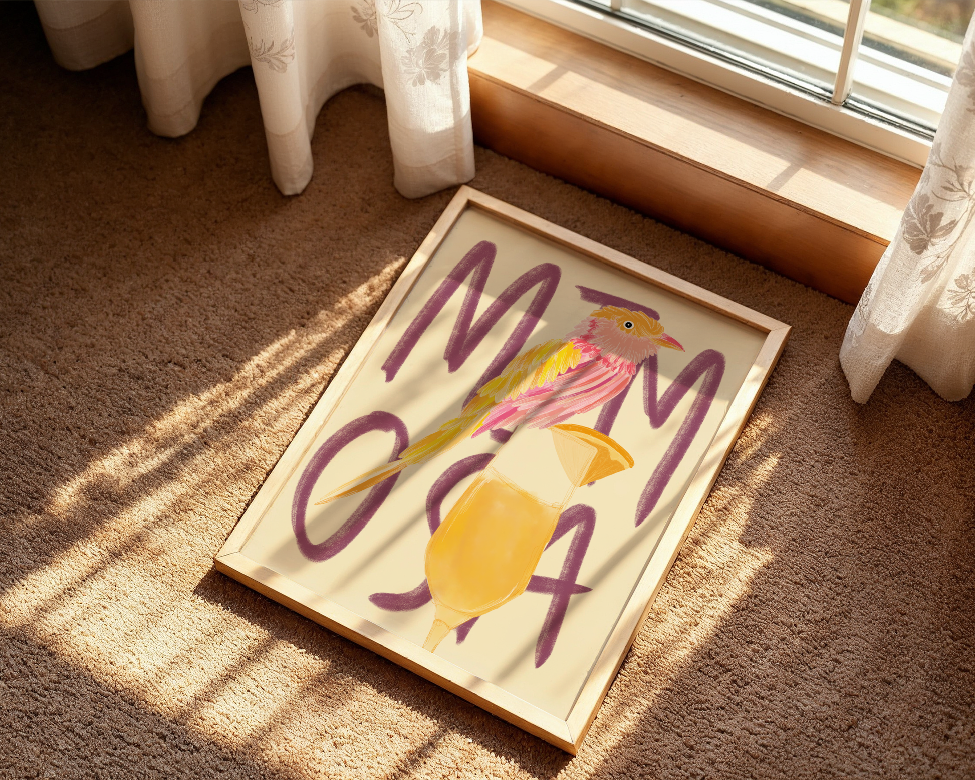A sunny little bird perched on a mimosa — because brunch isn’t brunch without a touch of fabulous. Bursting with bold yellows, punchy oranges, and pops of purple, this print brings pure golden-hour energy.