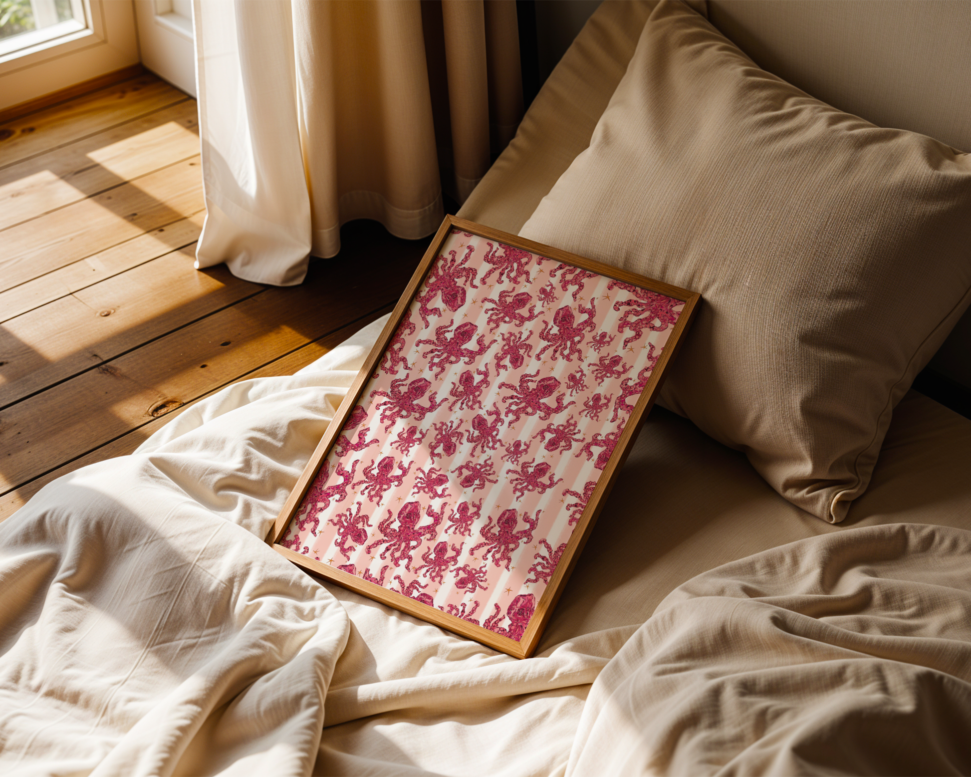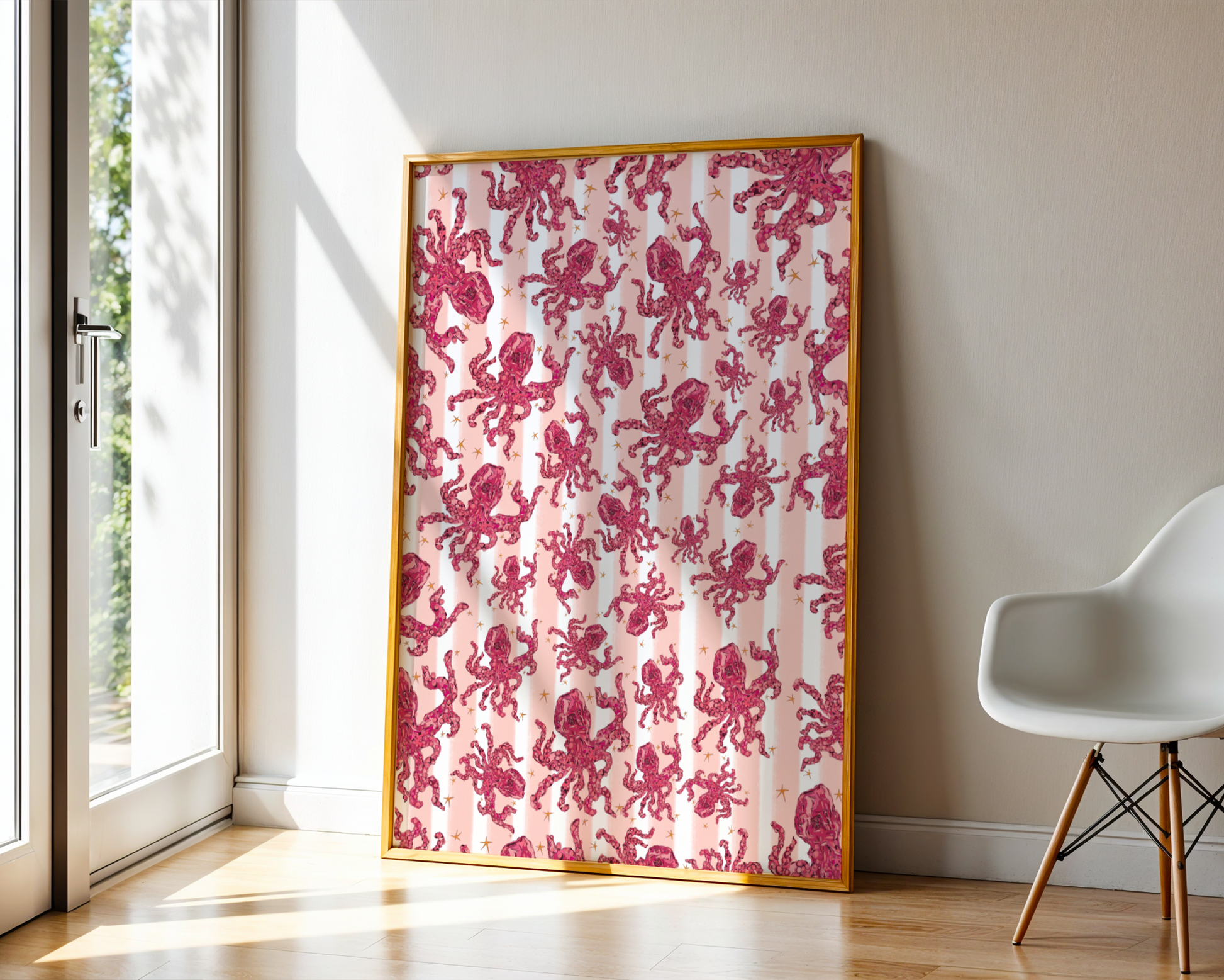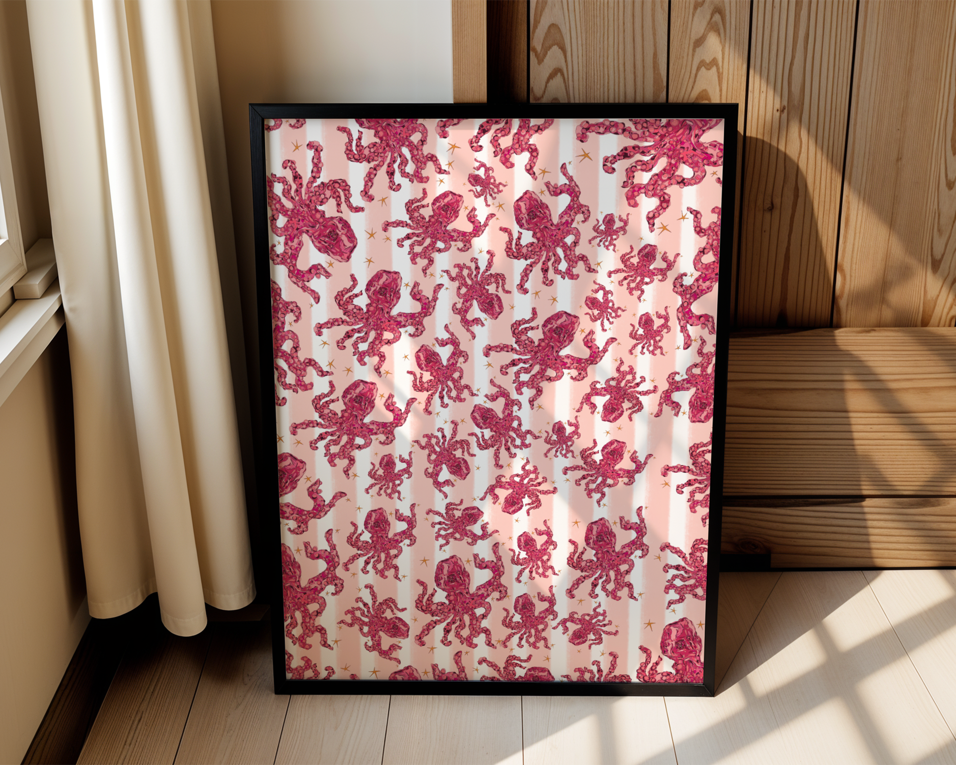 Meet the Octo Gang a bold pink octopus surrounded by playful stripes and plenty of attitude. This illustrated art print is fun, quirky, and full of personality, bringing a splash of ocean charm with a modern, colourful twist.