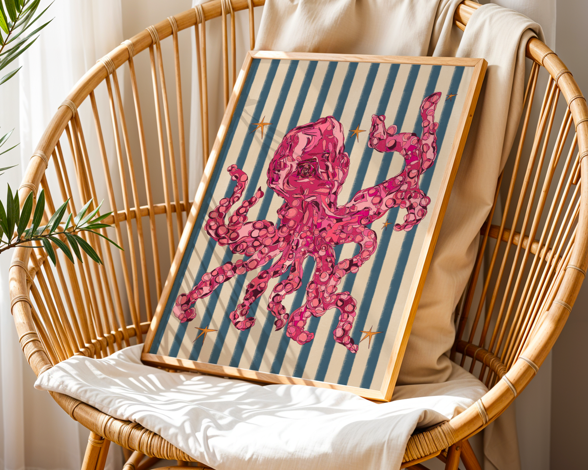 Hear under the sea with a fun striped octopus! Perfect for adding a splash of personality to your gallery wall, bedroom, or creative corner!