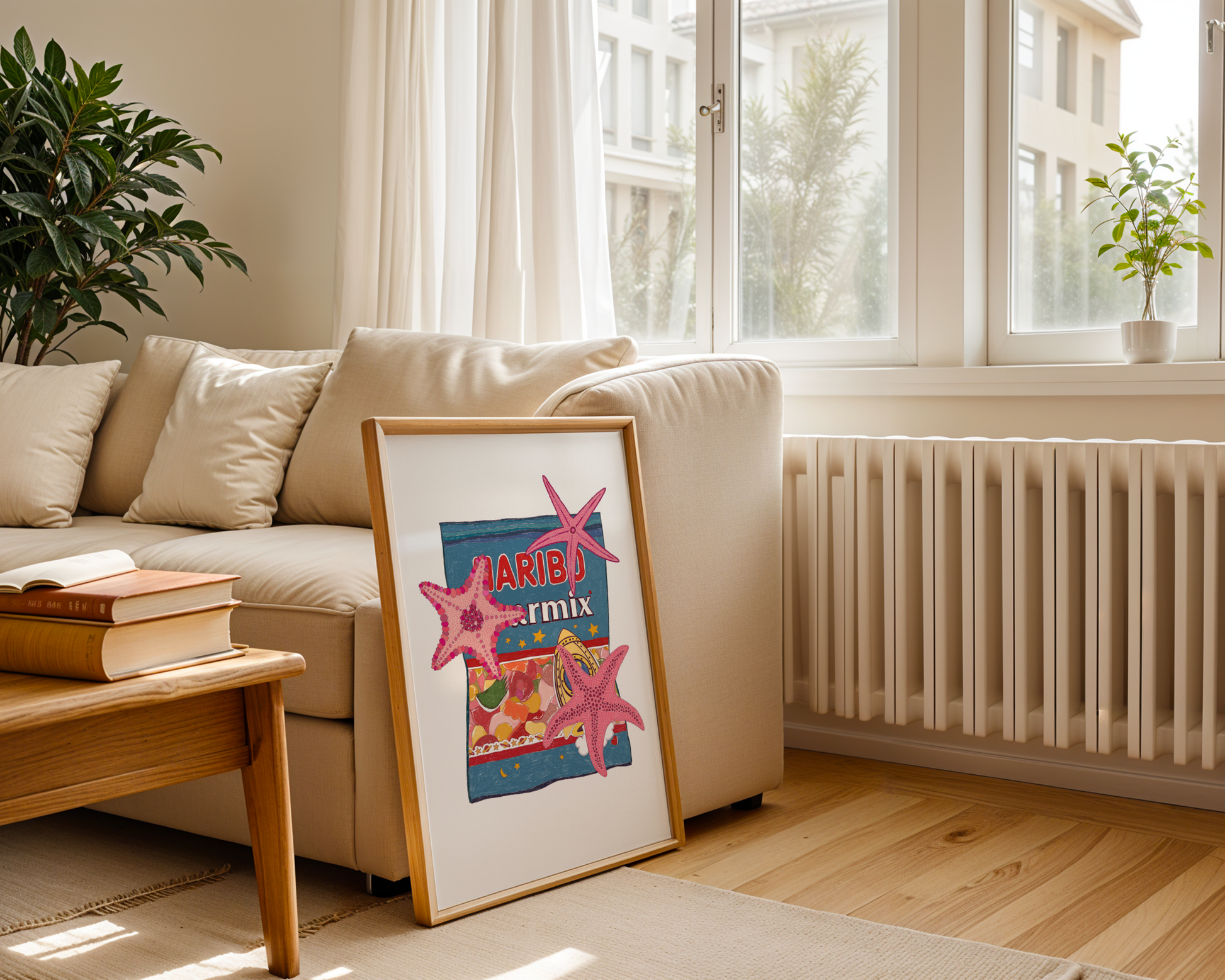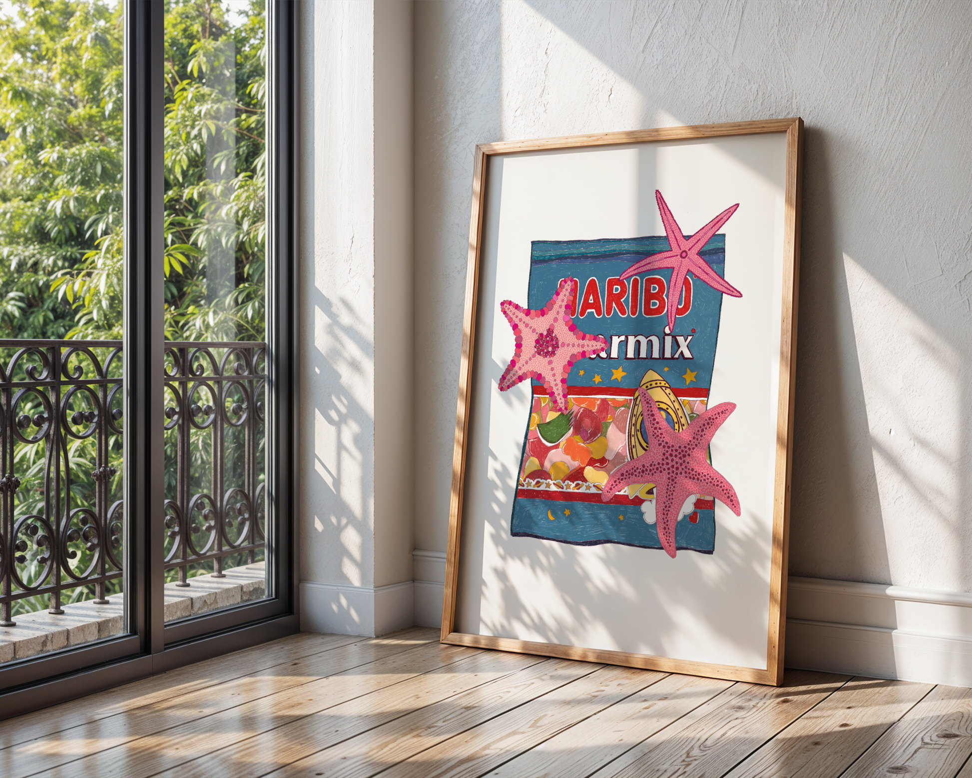 This playful print features a colourful sweet packet topped with starfish-shaped sweets, inspired by everyone’s favourite Star Mix vibes. Bright, bold, and bursting with personality, it’s the kind of artwork that instantly lifts the mood - like opening a bag of sweets you definitely planned to share (but won’t)!