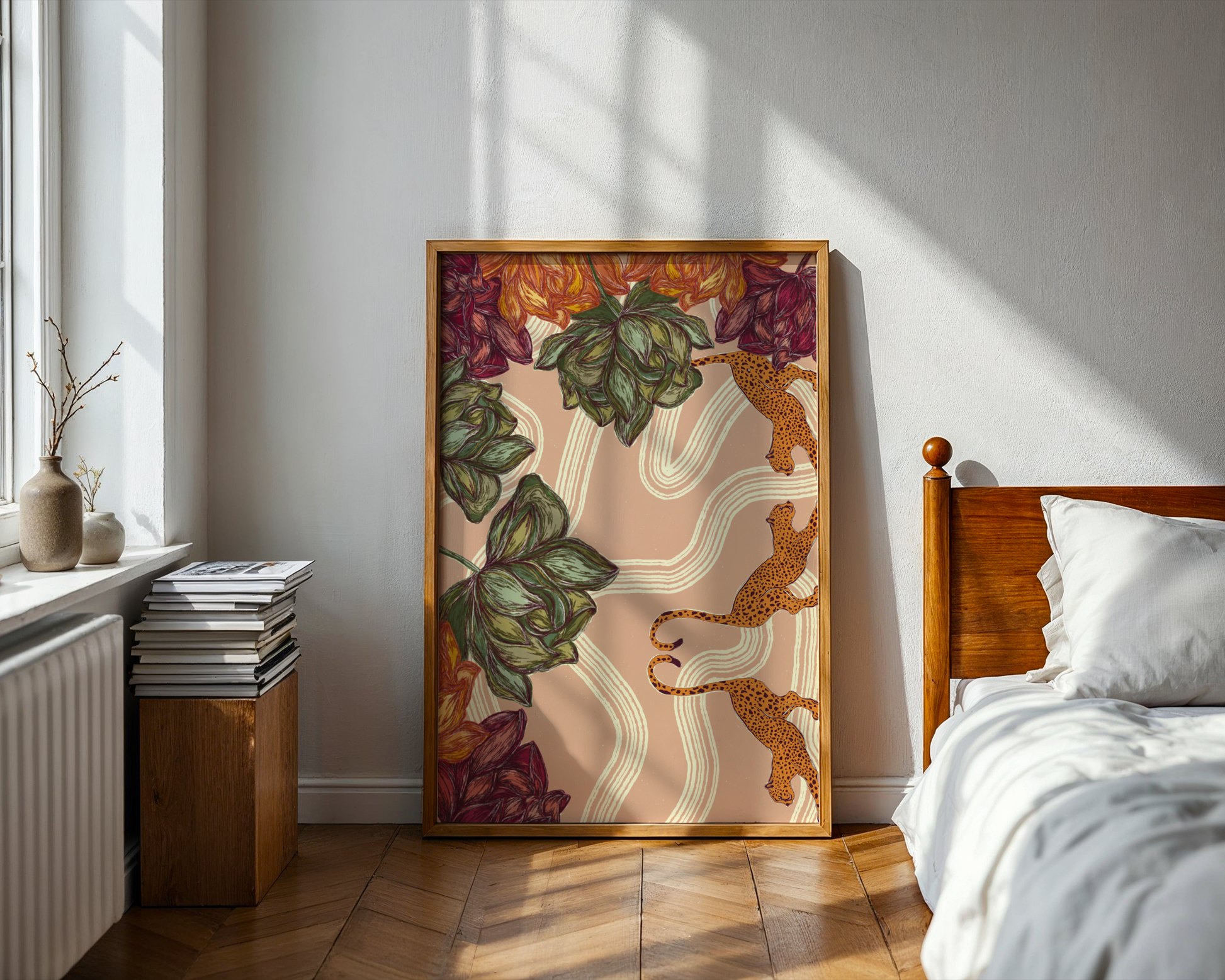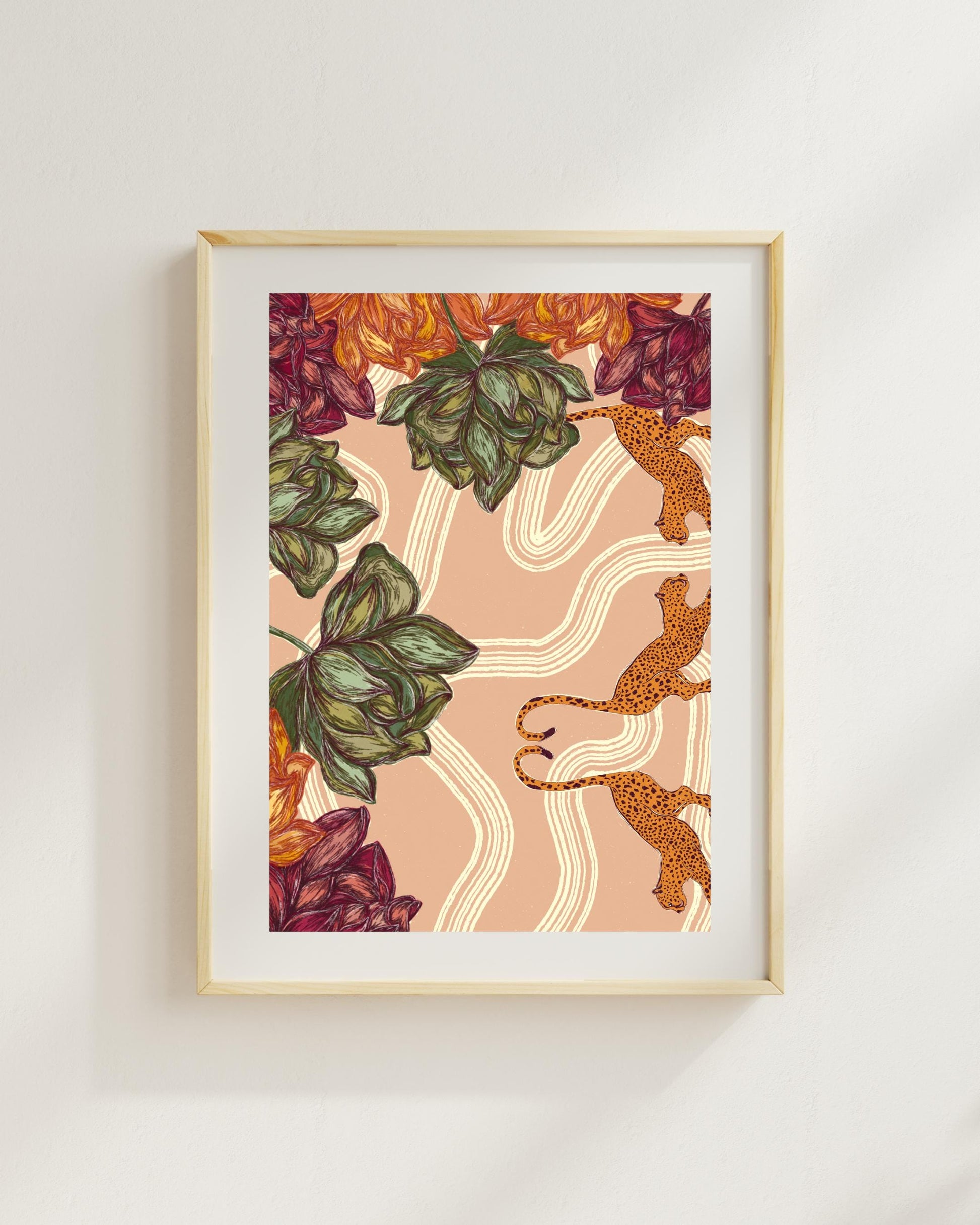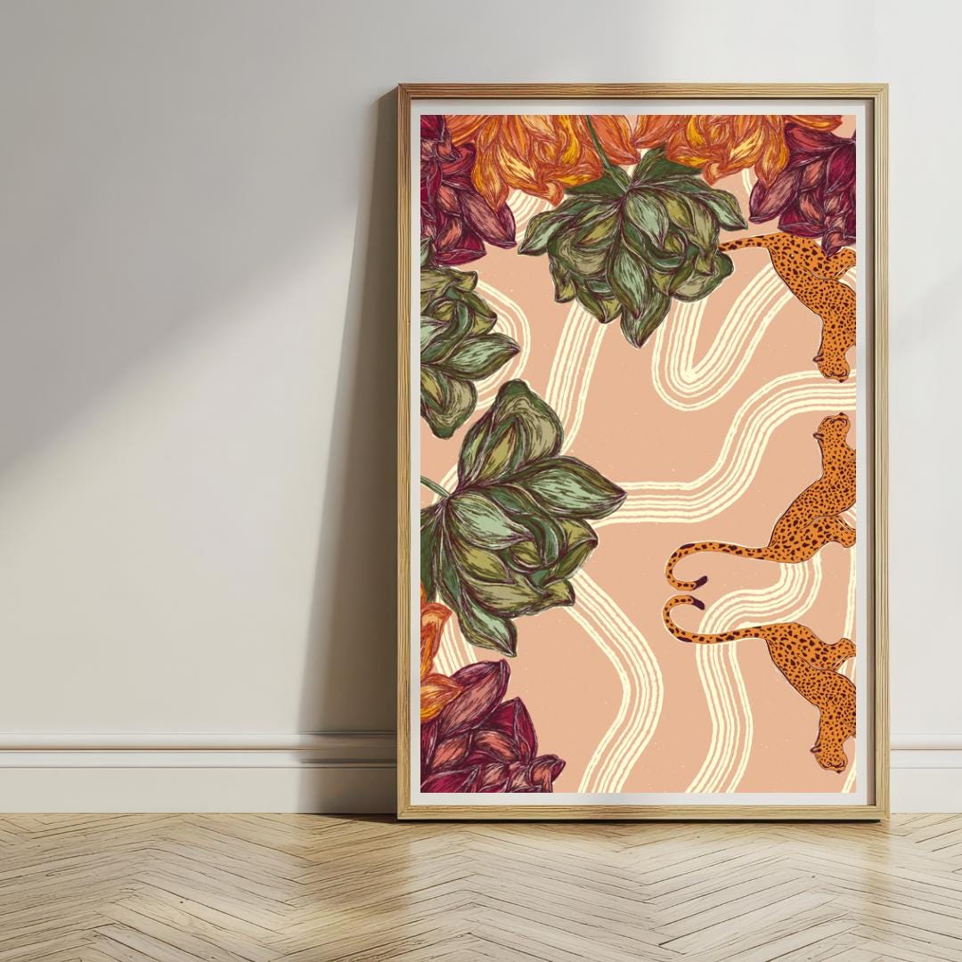 Two elegant leopards lounging amongst bold florals and dreamy swirls on a soft pink-beige backdrop — this print is a little bit wild, a little bit whimsical, and totally made to turn heads. Perfect for adding fierce-but-feminine energy to your gallery wall or making a statement all on its own!