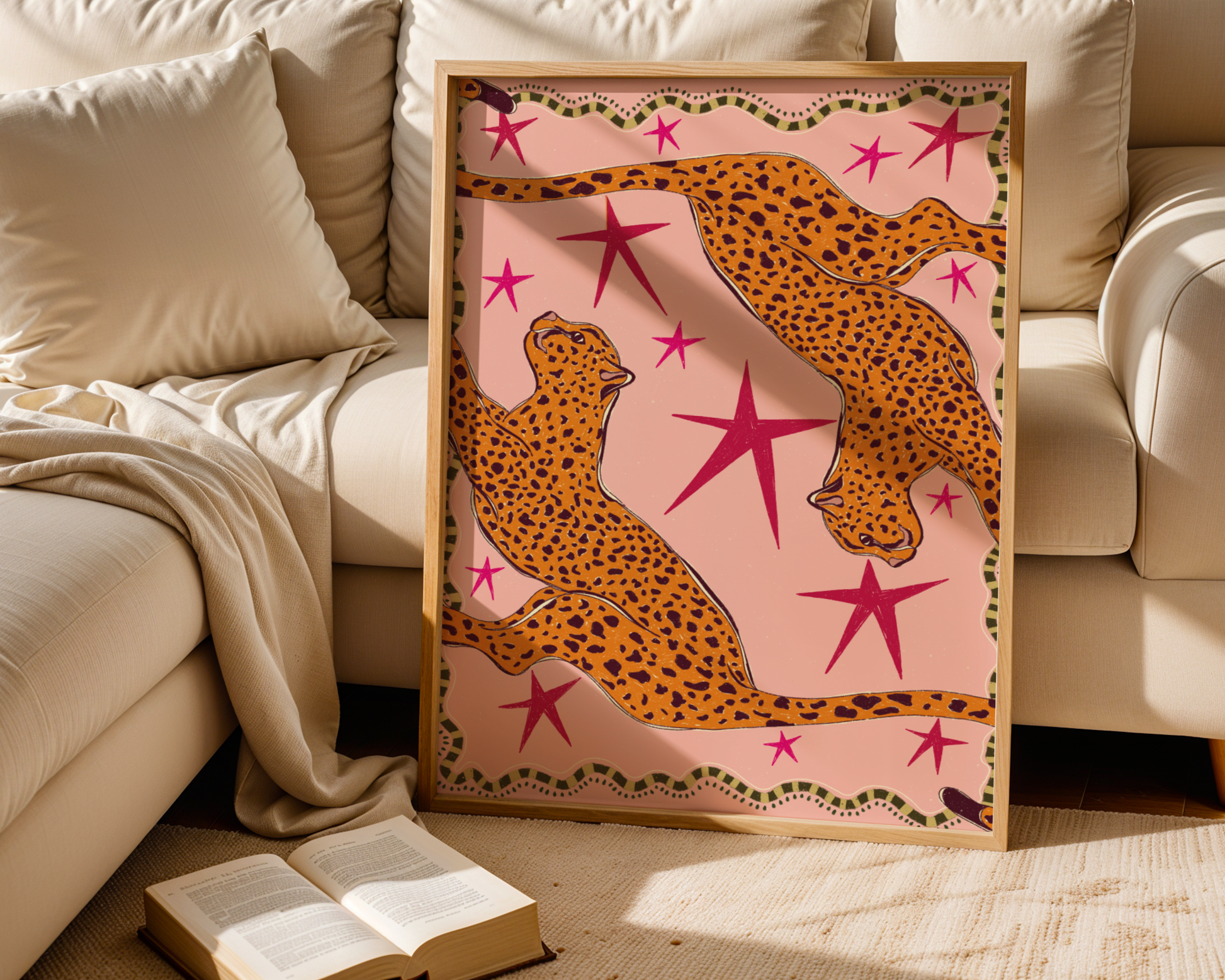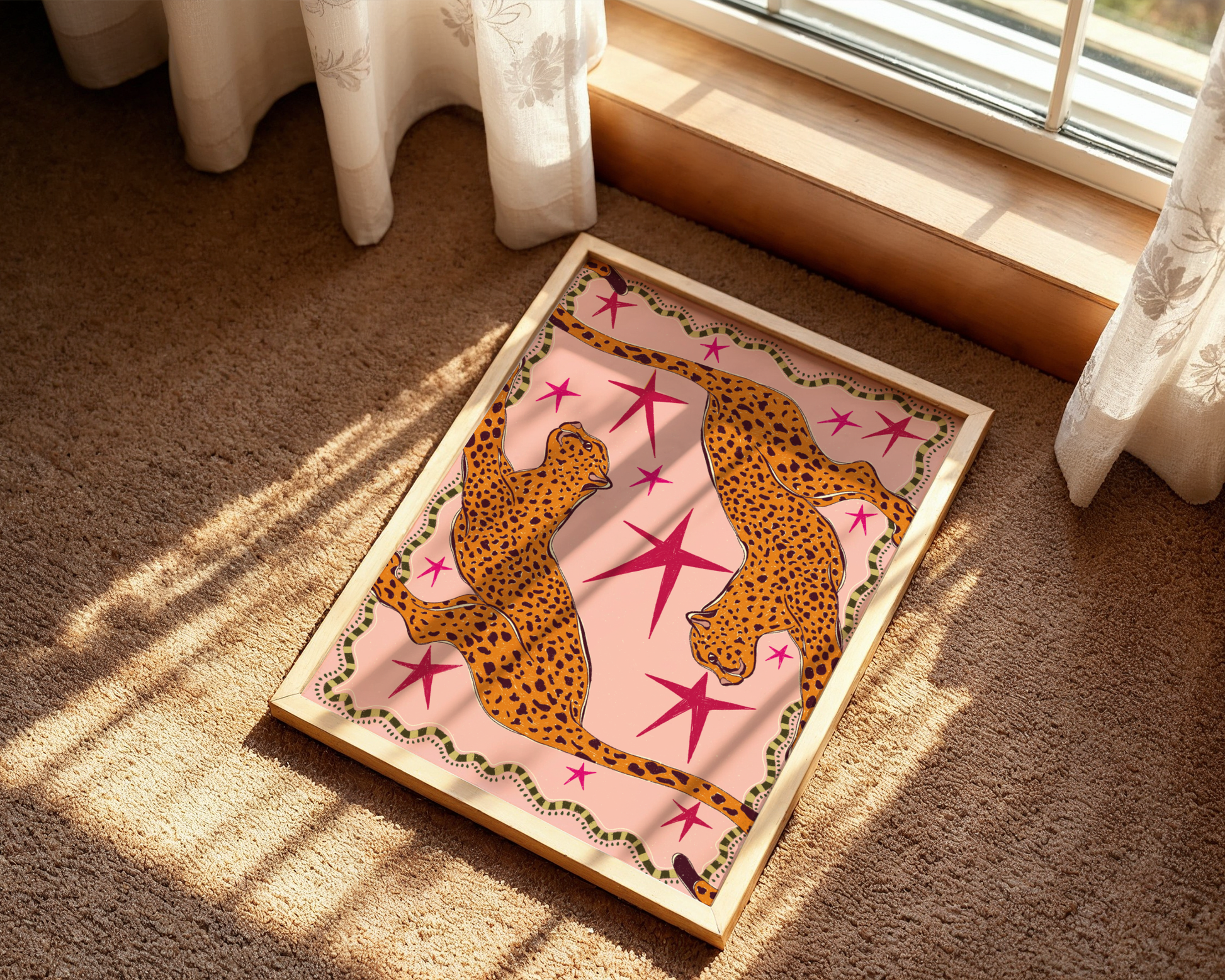 Let your walls go a little wild – in the prettiest way possible! Two chic leopards prowl across a pink backdrop, surrounded by bold magenta stars and wavy jungle borders. It’s a little bit retro, a lot girly, and totally full of personality!