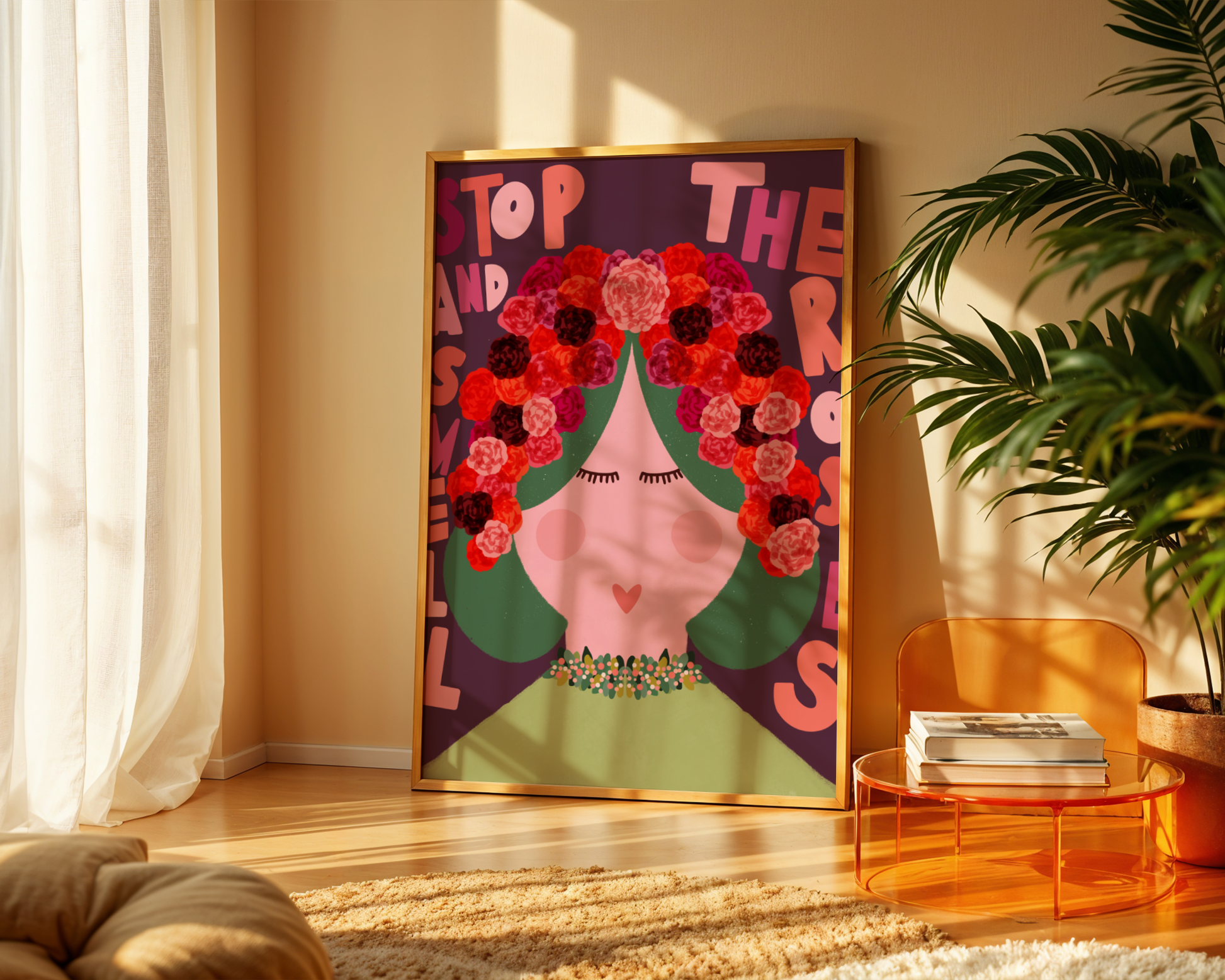 A bold purple backdrop, a dreamy flower crown, and a Frida-inspired portrait reminding you to slow down and soak up the beauty. This print is all about colour, confidence, and a touch of whimsy — the perfect blend of artful and uplifting. Hang it where you’ll see it every day and let it be your pretty little reminder to pause, breathe, and bloom!