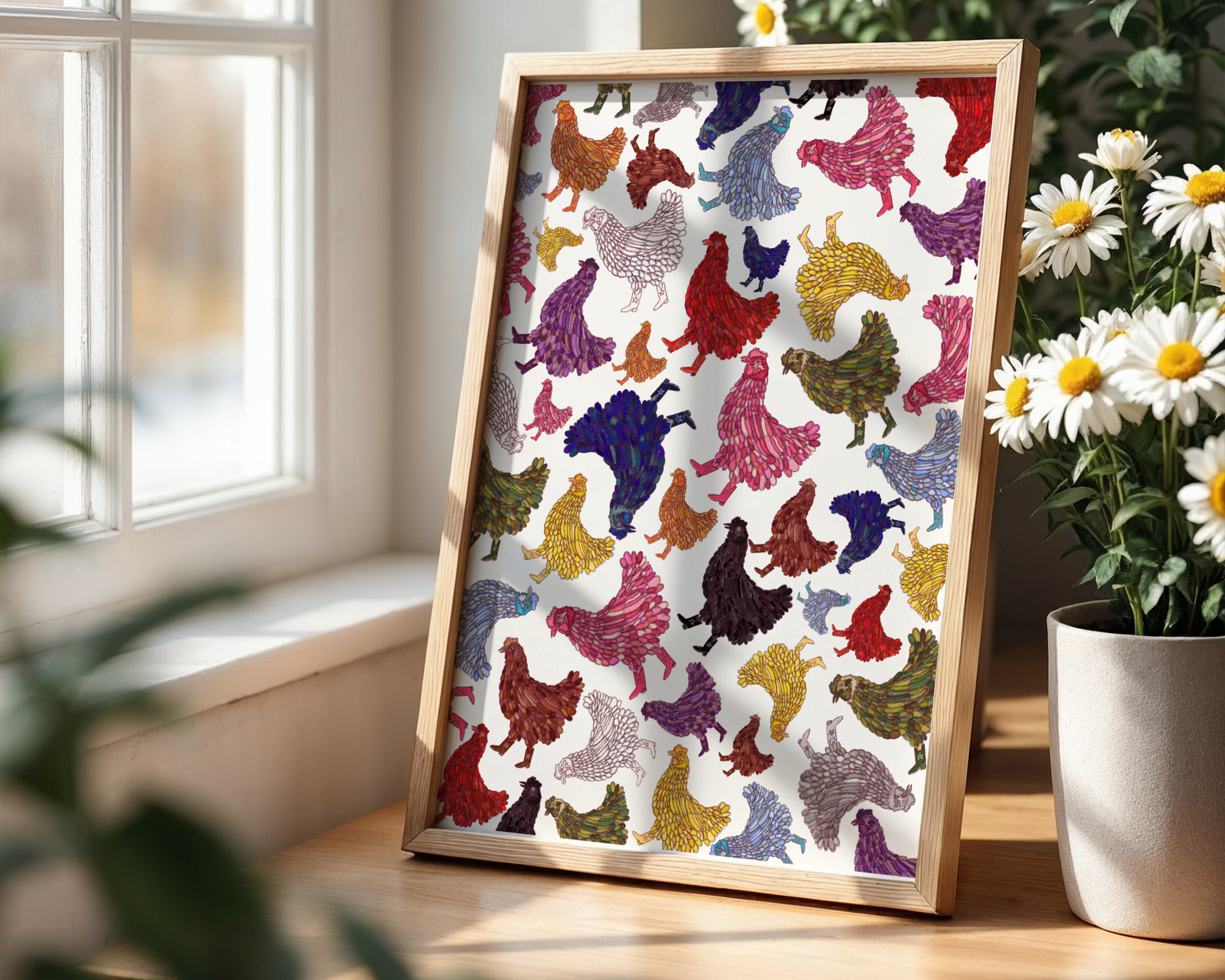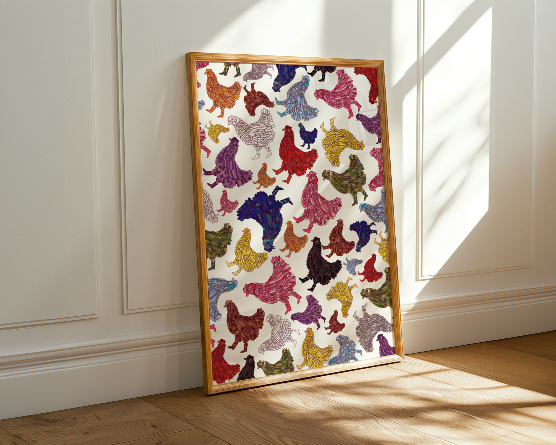 Meet Rainbow Hens a colourful little gang of cowboy-boot-wearing chickens, all lined up and ready to strut. Each one’s rocking her own bright colours, all popping perfectly against a clean white background. It’s fun, cheerful, and just a tiny bit ridiculous in the best way. The kind of print that makes you grin every time you walk past and think, “yeah… that’s my vibe."