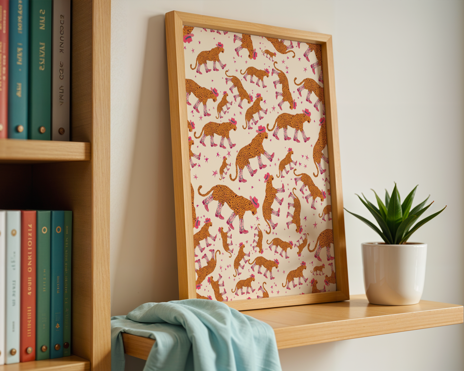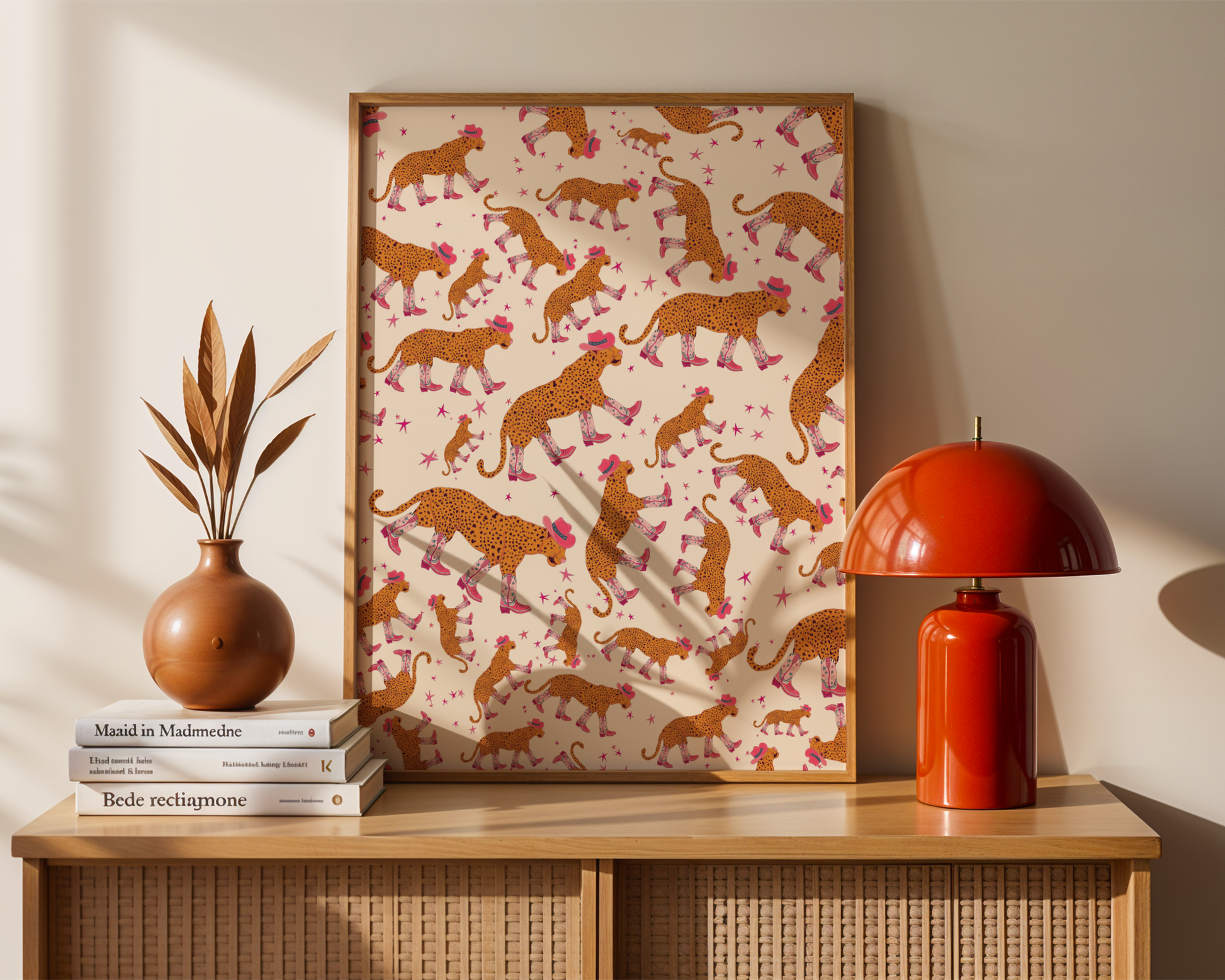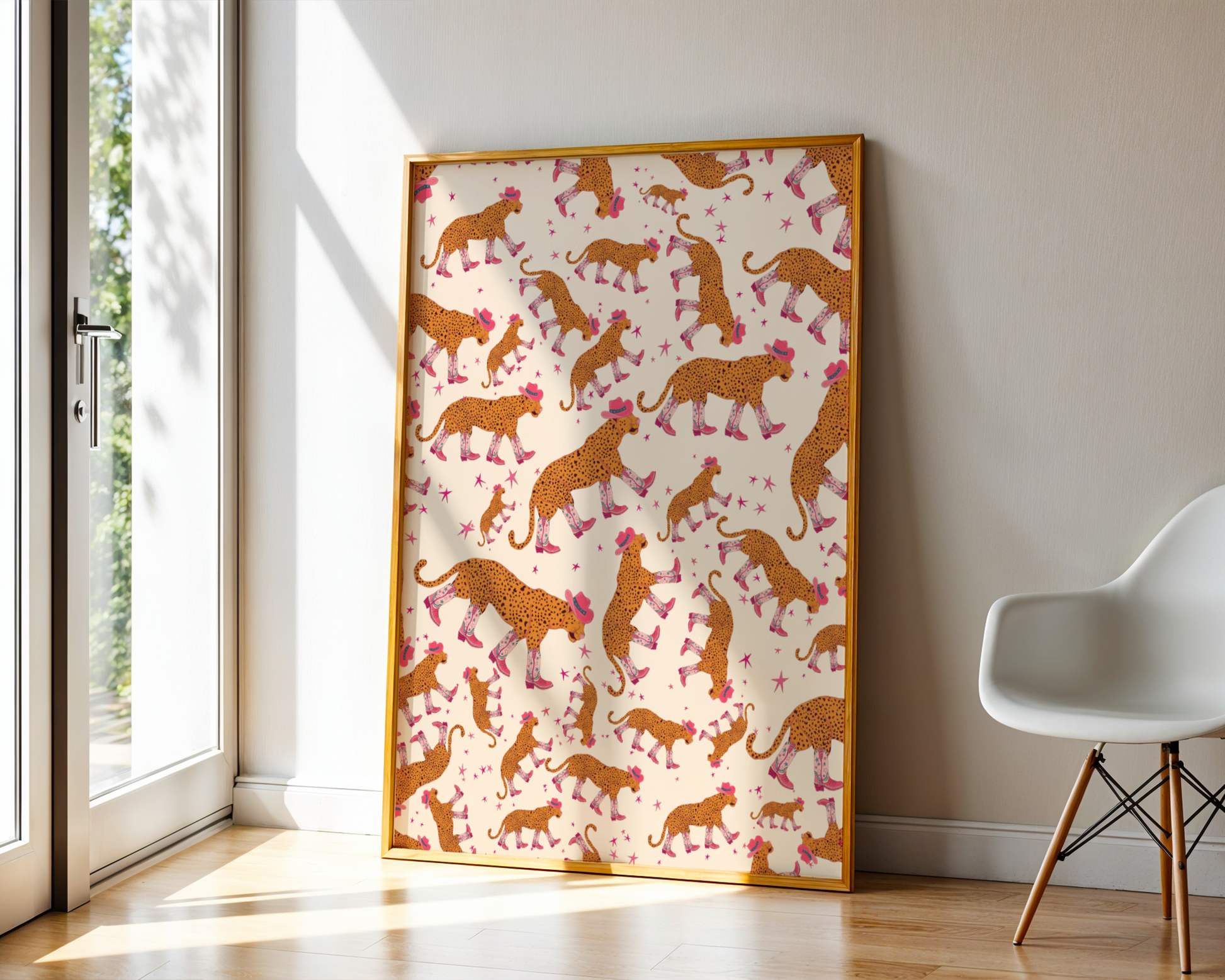 A whole pattern of leopards rocking cowboy boots, because subtlety is overrated. This illustrated art print is bold, playful, and full of personality, mixing wild animal energy with a cheeky Western twist.