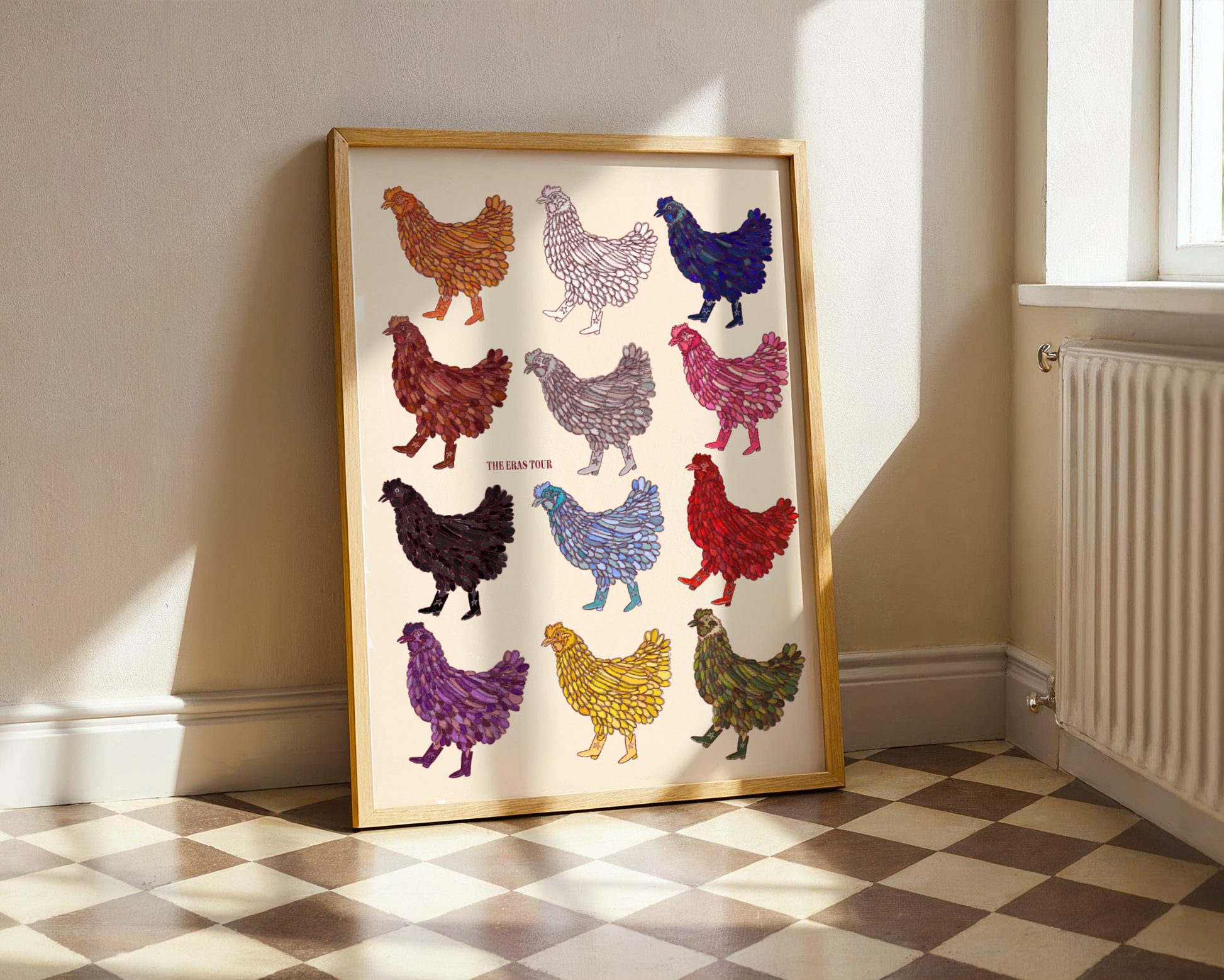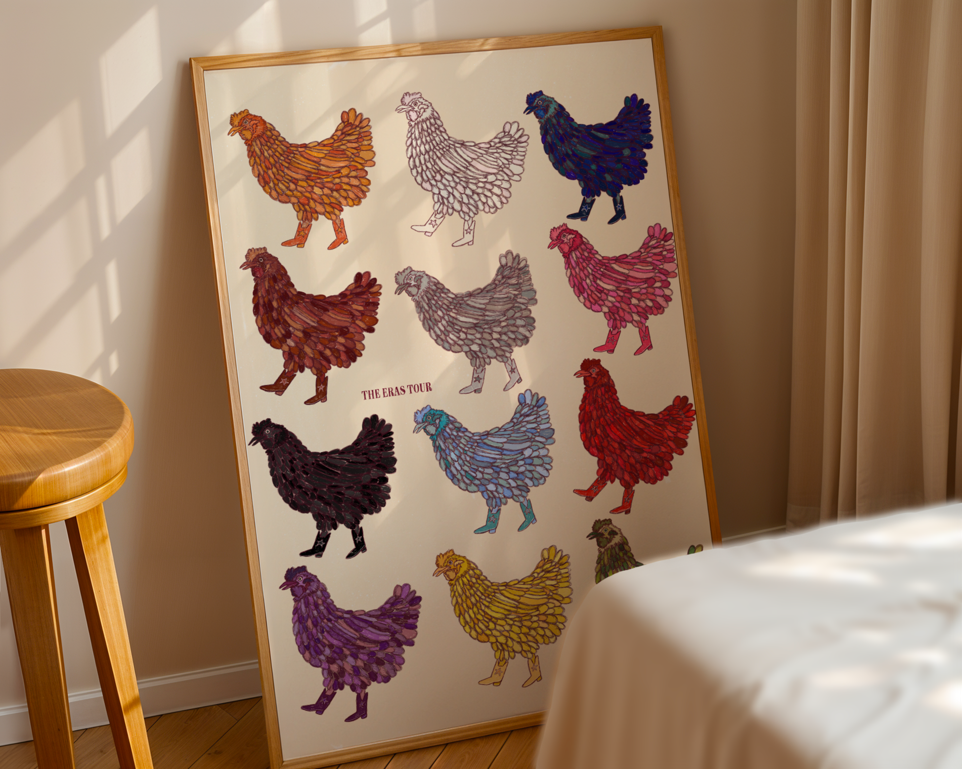 Every era, but make it hens. Each little chicken struts in her own colour palette — from Debut pastels to Reputation darkness to Lover pinks — bringing full Swiftie energy to your walls. It’s playful, bold, and the perfect blend of yeehaw and easter-egg chaos. A must-have for girlies who know every lyric, every outfit, and every iconic era!